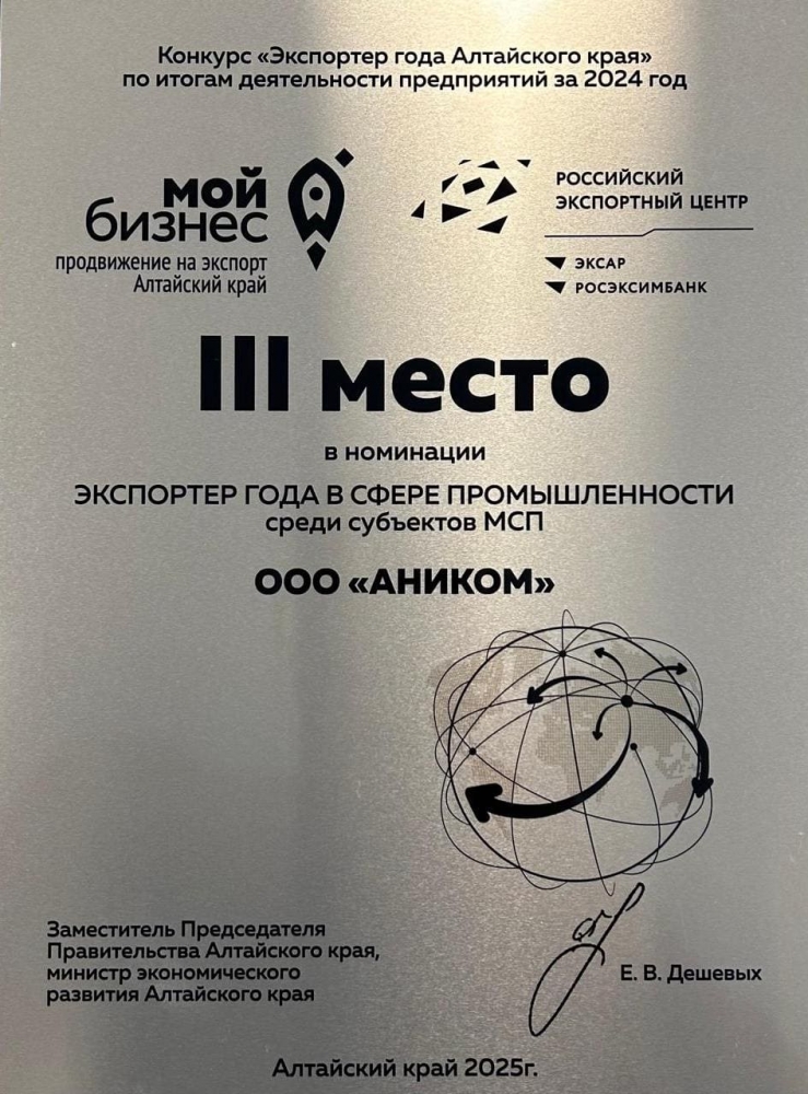 • В 2025 году компания АНИКОМ стала лауреатом в конкурсе «Экспортер года Алтайского края»